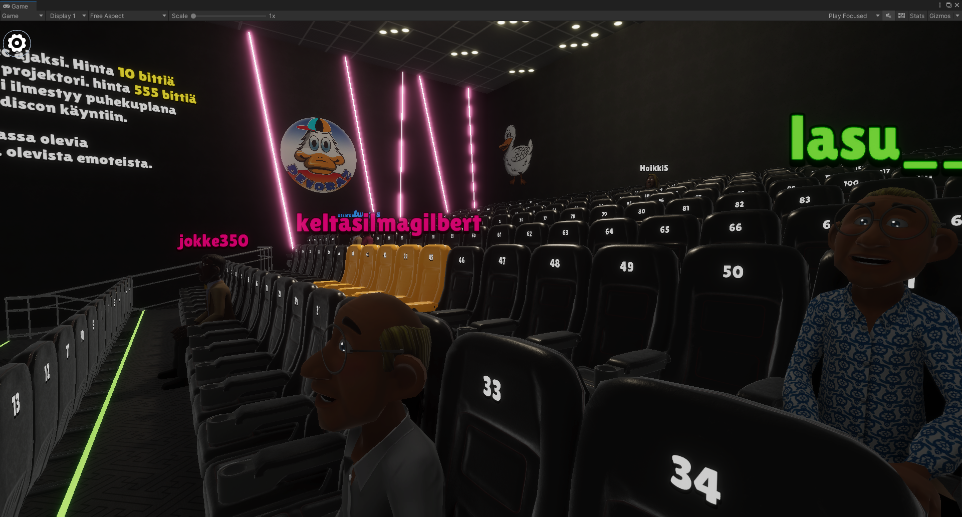 Viewers can join on cinema by writing something on chat. Vierwers can interact in cinema with different way. Using bits they talk, throw other viewers and other things. Also if someone subscribe everyone start dancing. Streamer can also move hes own character and throw viewers out or change theirs seat.