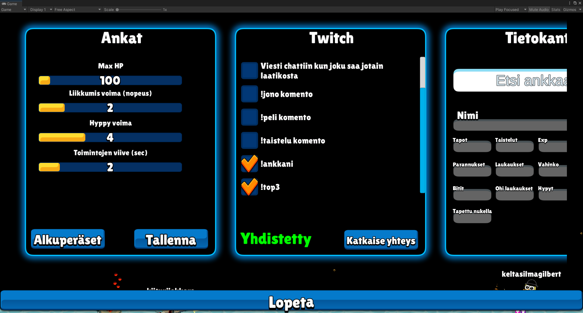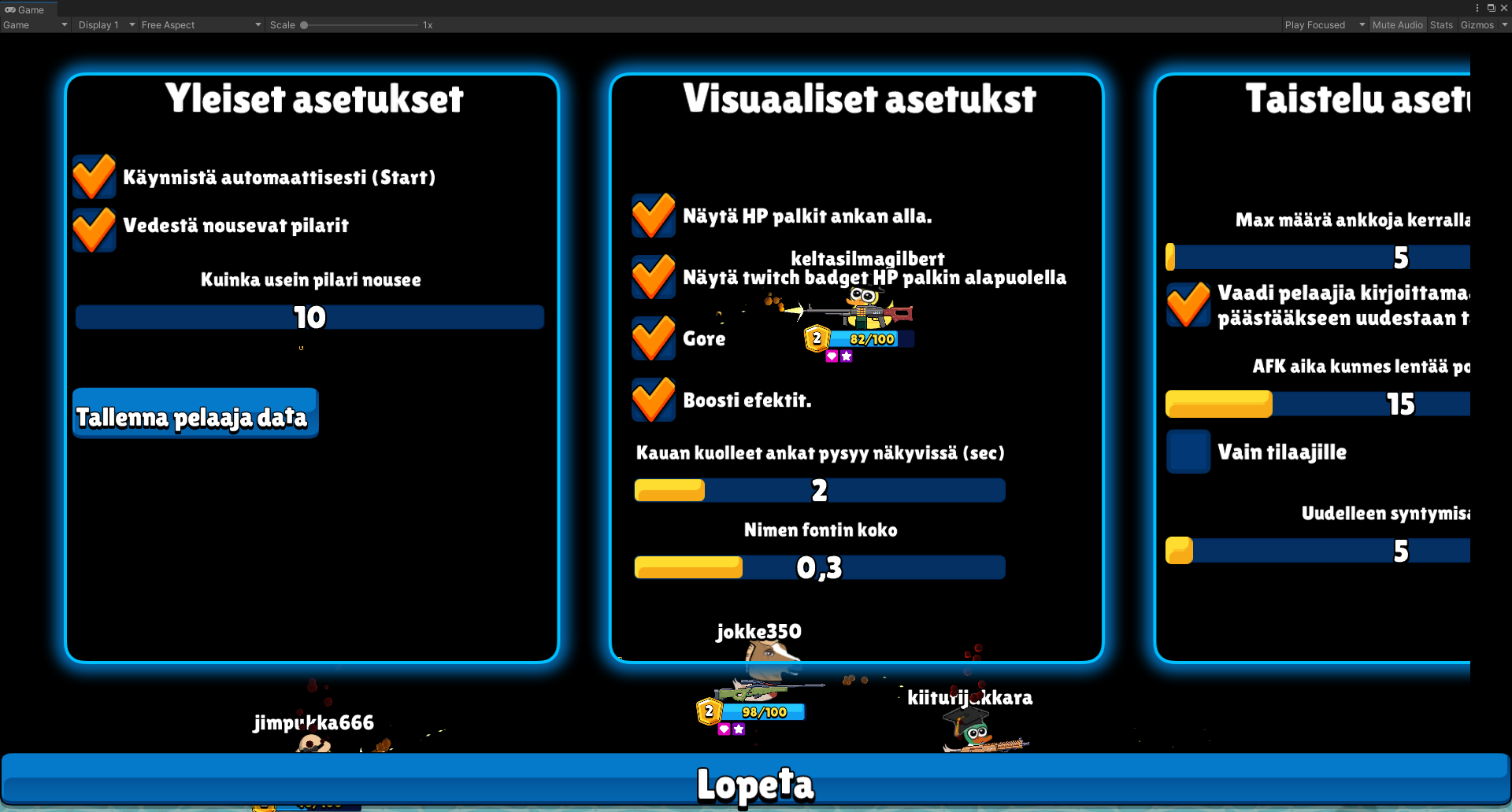 Viewers can join on battle by writing somehing on chat. Ducks keeps shooting eachother till they die. Game keep leaderboard for kills. Viewers can also use channelpoints spawn different things like nuke, supply creates, timeout other ducks, turn water to lava and many other actions.