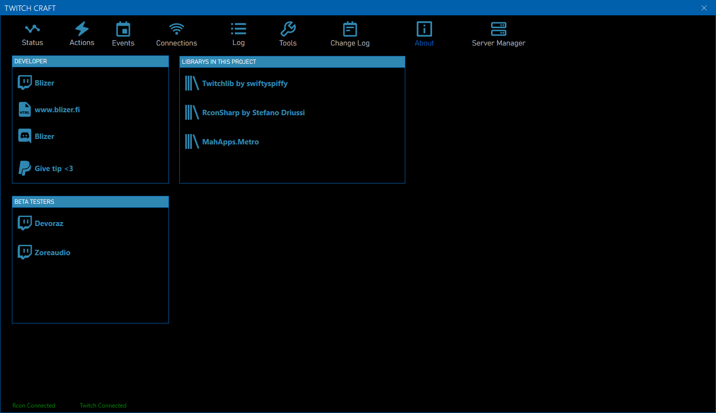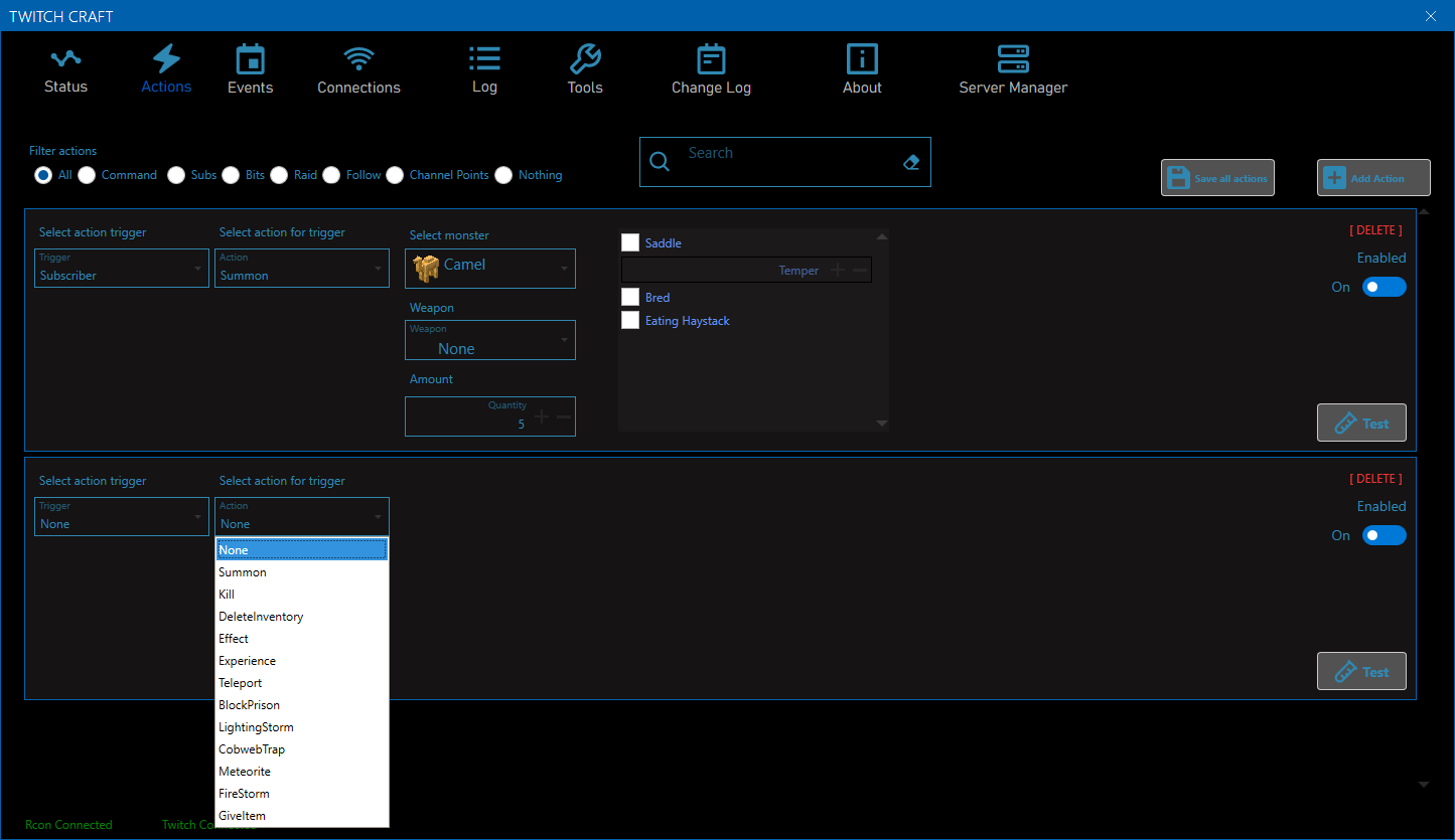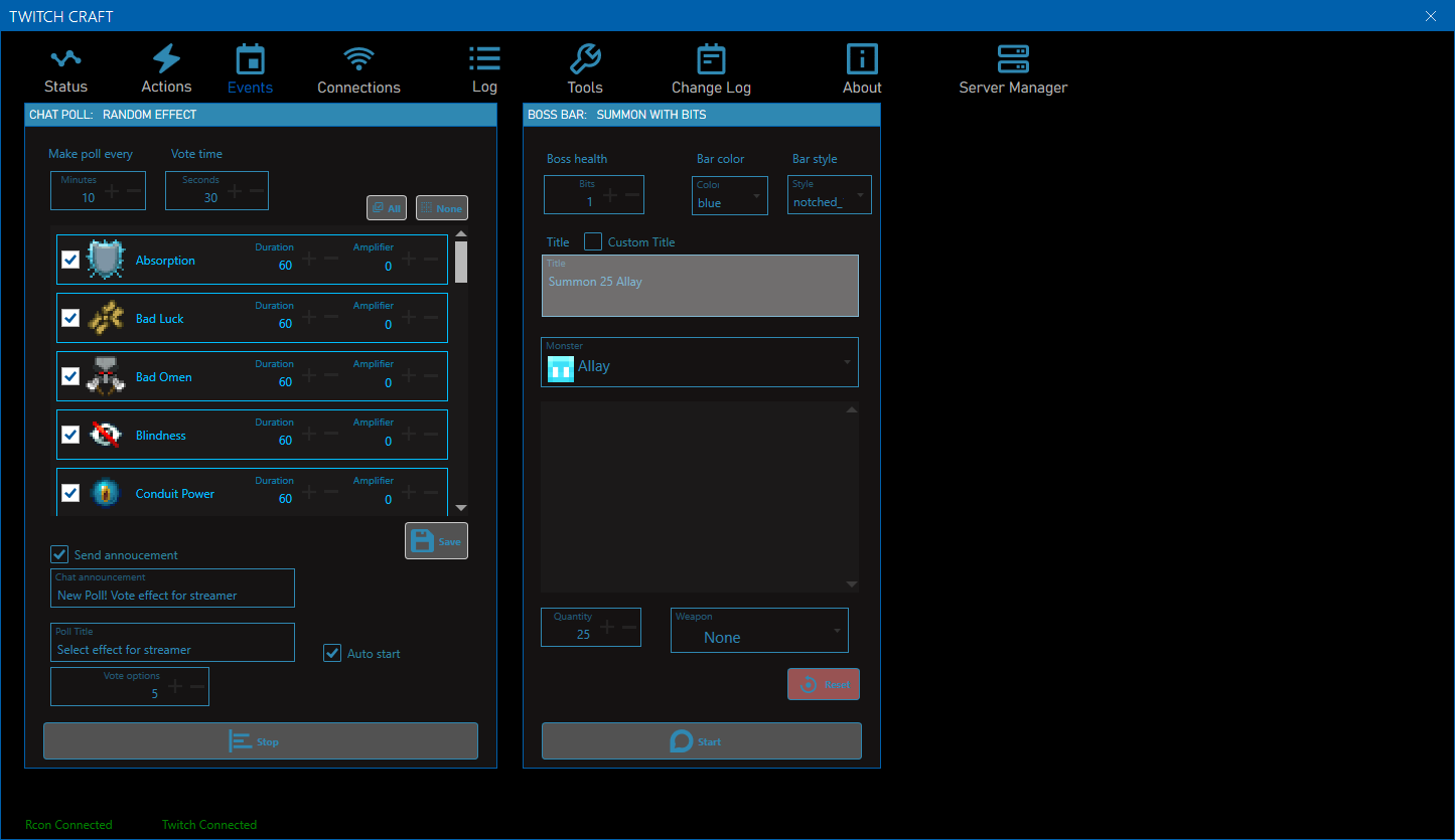 This program send rcon commands to minecraft client. This program let twtich streamer make action and events. These events trigger by subscripton, follow, raids, bits and channel points. Possible events are summon monsters, insta kill streamer, delete inventory, give effect, set experience, teleport... and many more.