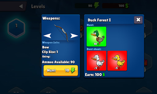 Game have normal hunt levels, bonus cash levels, challenge levels and bosses. Earn cash and buy new guns and more ammo.