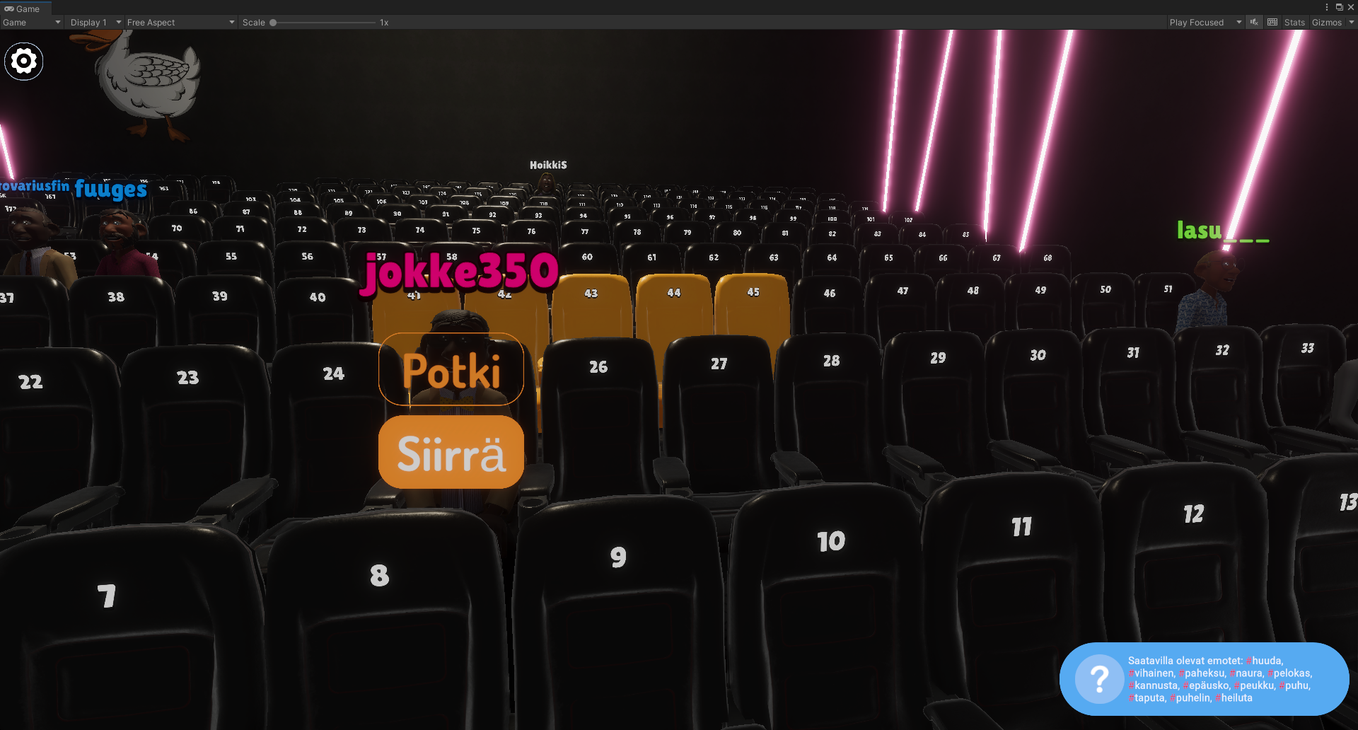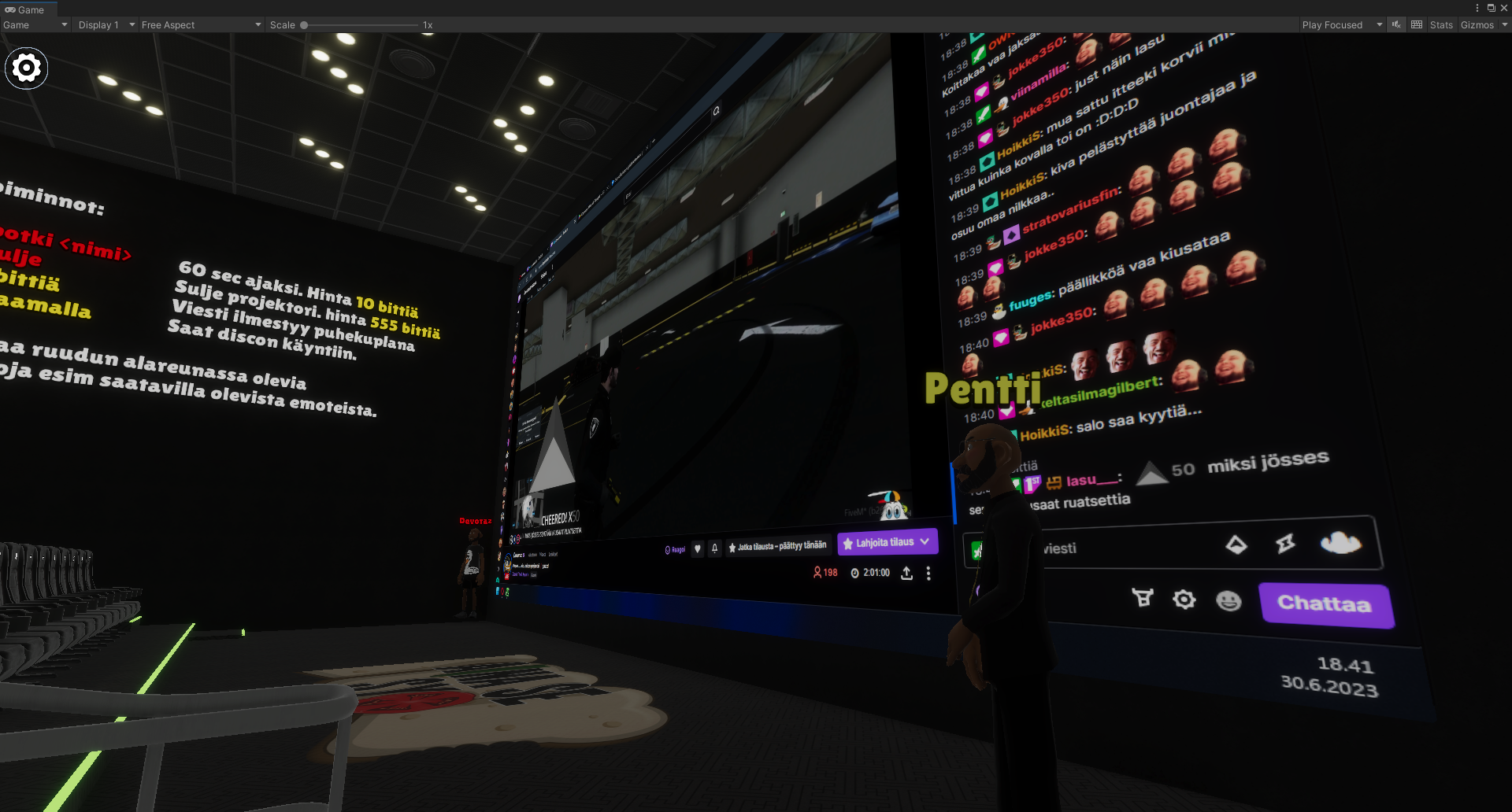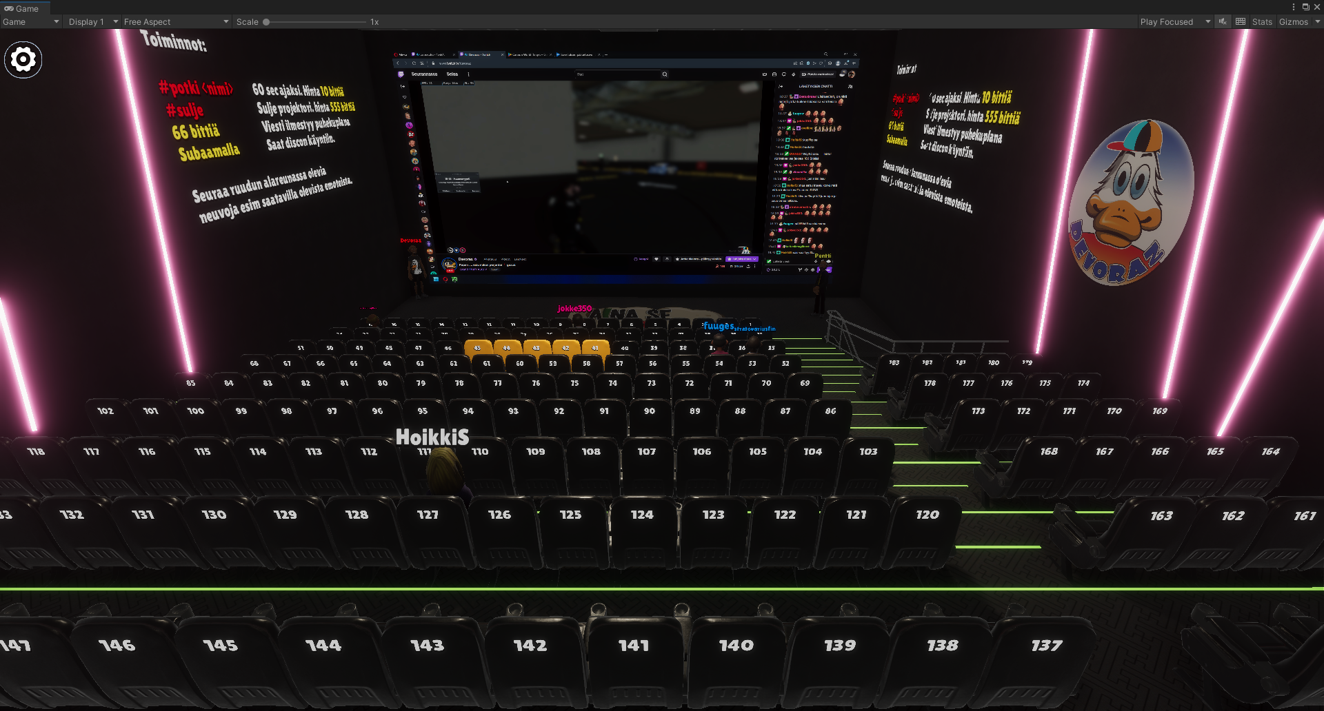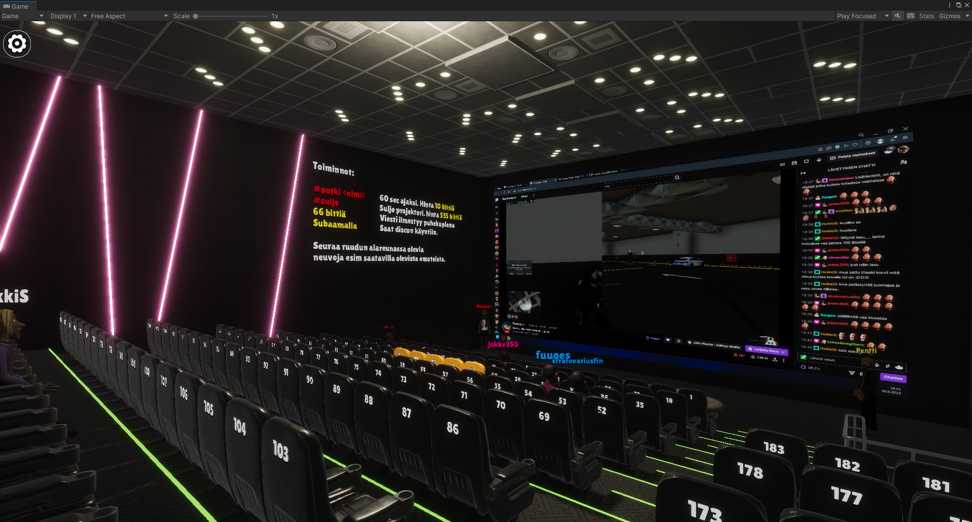 Viewers can join on cinema by writing something on chat. Vierwers can interact in cinema with different way. Using bits they talk, throw other viewers and other things. Also if someone subscribe everyone start dancing. Streamer can also move hes own character and throw viewers out or change theirs seat.